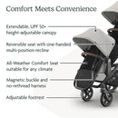 Reversible and Adjustable Seating: Allows children to ride forward-facing or parent-facing with a multi-position recline for maximum comfort.