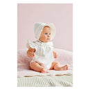 The bonnet showcases exquisite smocked embroidery, adding a touch of elegance and timeless style