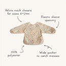 Designed for Comfort: Made with 100% Polyester and 100% Cotton Trim, the soft long sleeve bib's wide pocket easily catches food while the bib stays secure and fully covers outfits. With a velcro closure at the back of the neck, it's perfectly sized for littles between 6 and 24 months.
