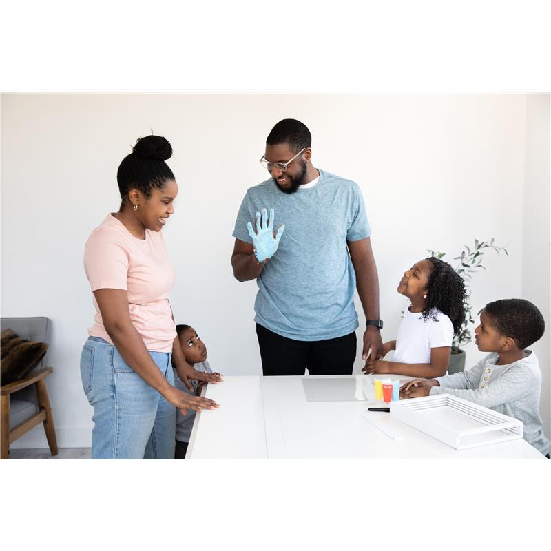 All-In-On Kit: With a white floating frame with removable cover and slots for each handprint sheet, 4 clear, plastic sheets to keep each print separate for a 3D effect, a black marker for adding names or special dates, and tubes of non-toxic red, yellow, blue, and white paint.
