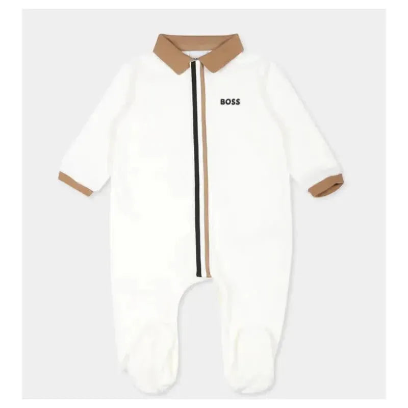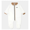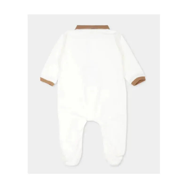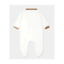 Ivory chenille babygrow, long sleeves, with pointed collar, front closure with snap buttons and striped detail, feet, contrasting cuffs with ribbed hem. It is embellished with logo embroidered on the chest. This garment is made with 75% organic cotton