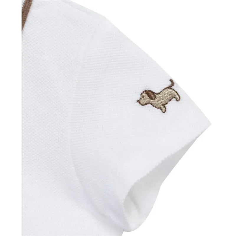 Adorable puppies play on this baby boys' short-sleeve shortall set. Made from cotton, the classic polo shirt layers underneath a pair of baby boys' shortalls fastened with no-pinch buttons and snaps for easy changing.