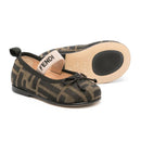 Monogrammed ballerinas from Fendi Kids brand. Brown color, cotton, calfskin leather, elastic side panels, monogram print all-over, round toe, flat rubber sole. Fendi Kids has a recognizable brand print, popular all over the world. The children's collections repeat adult models, combining luxury and comfort.
