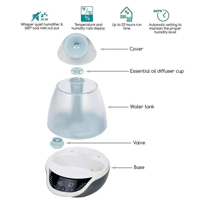 ESSENTIAL OIL DIFFUSER & 360-DEGREE MIST NOZZLE: Hygro+ gives you the option to adjust the mist direction and speed, as well as add your favorite restful scent for rooms up to 215 sq. ft. thanks to a small container placed under the mist output.