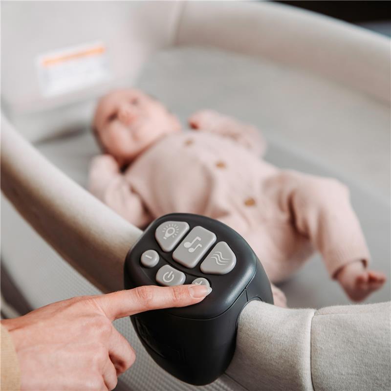 During the newborn stage, keep baby close in their own safe sleep space. With adjustable height settings, mesh side panels, and smooth swivel wheels, you can position the bassinet right next to your bed and glide it effortlessly from room to room. The portable bassinet design includes a firm, flat mattress with soothing melodies and gentle vibrations to help soothe baby to sleep.