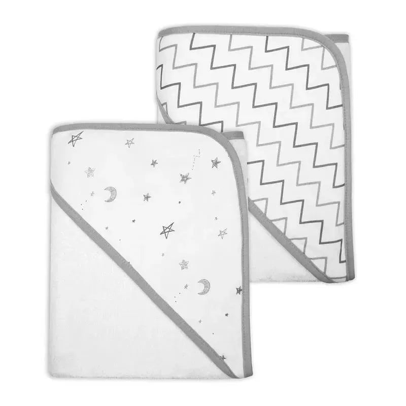 American Baby - TL Care Terry 2 Pack Hooded Towels, Organic Cotton, Grey Stars/Grey Zigzag