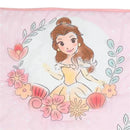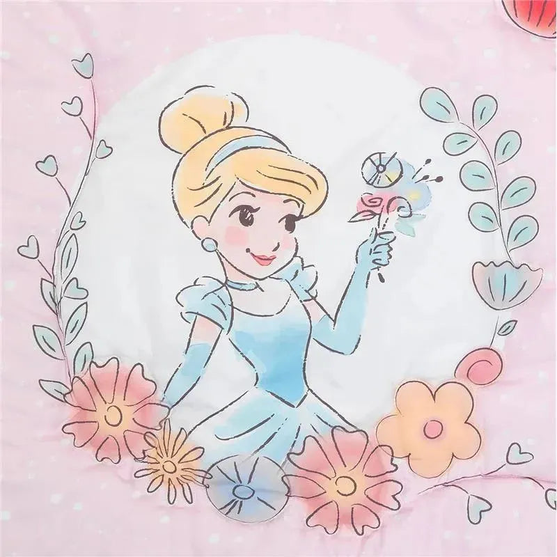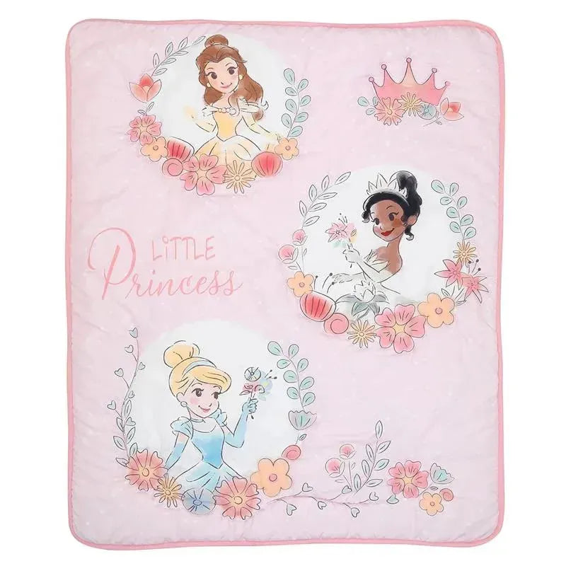 This charming officially licensed Disney Princess bedding set includes one quilt, one fitted crib sheet, and one crib skirt. The quilt features three Disney Princesses, Belle (Beauty and the Beast), Tiana (Princess and the Frog), and Cinderella. All three princesses are wearing their favorite ballgowns. Belle in yellow, Tiana in green and Cinderella in blue. A floral border in pastel colors circle around each princess. The fitted crib sheet is on a pink ground and features all three princesses. The crib sheet has elastic all the way around ensuring a safe and secure fit on a standard sized crib mattress measuring 52” x 28”. The pink crib skirt has tossed white stars and a charming garland of pastel flowers. This set is made of a soft microfiber fabric which is eco friendly and machine washable for easy care.