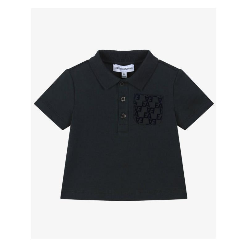 Dark navy blue polo shirt for baby boys by Emporio Armani, made in soft cotton jersey. This classic style has a button-fastening placket and a ribbed collar. A small pocket on the chest features the brand's distinctive EA logo in a navy blue flocked design.