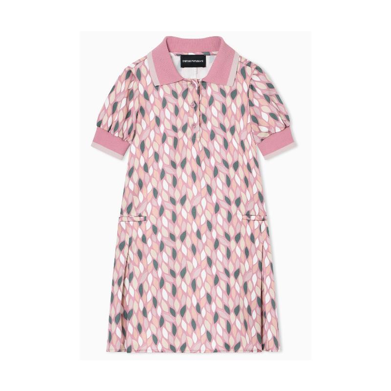 Dress with polo-shirt collar and partial button fastening. The piece is made of viscose from responsible forestry, made distinctive by an all-over EA logo print.