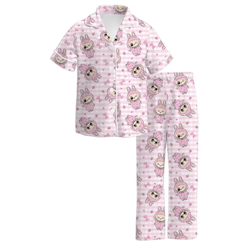 Auraquise - Labubu Print Fall Pajama Set Soft & Cozy Short Sleeve & Long Pants, Pink