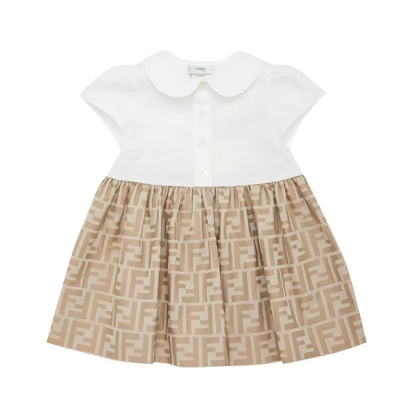 Junior dress with white poplin top and dainty buttons. Beige cotton jacquard skirt with all-over tone-on-tone FF logo.