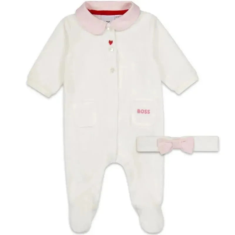Adorable ivory babygrow and headband set for girls by BOSS Kidswear. Made in soft organic cotton velour, the babygrow has a pink jersey collar, faux front pockets with pink logo embroidery, and an embroidered red heart on the button placket. The matching headband is soft and stretchy with a sweet pink jersey bow detail.