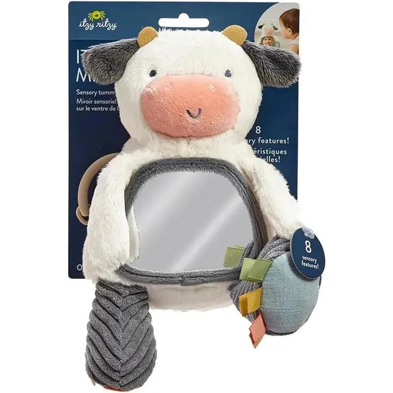 Itzy Ritzy's mirror toy features a cute cow character and makes a perfect tummy time mirror or toy to hang from a car seat or stroller