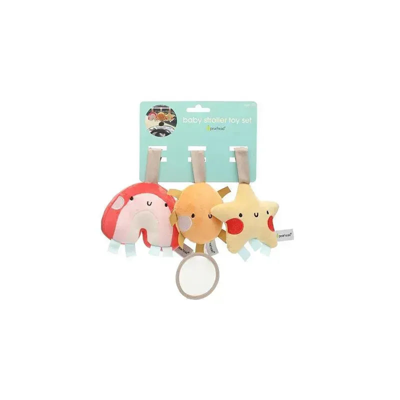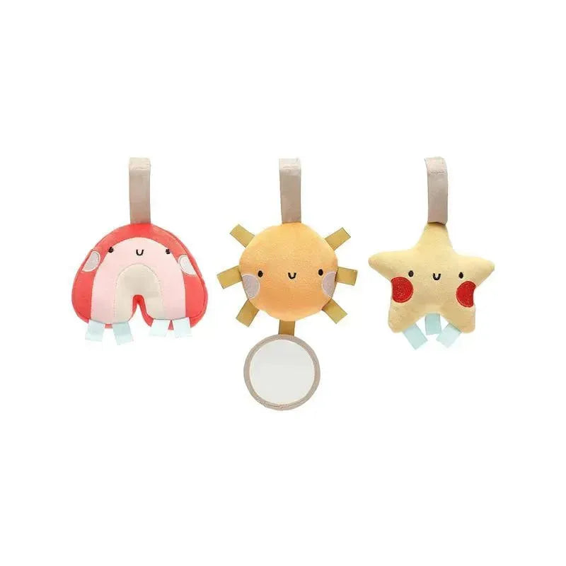 Your little one has arrived! Now it’s time to make sure you have all the newborn accessories you need to make traveling and being on the go with your baby girl or boy a breeze! This star, sun and rainbow stroller toy set by Pearhead is the perfect baby girl accessory or baby boy accessory for new parents and their little ones - and will quickly become a family favorite! This baby toy set includes three hanging plush toys, each with a hook and loop closure. Set includes 1 rainbow, 1 sun and 1 star with interactive tug tabs, squeakers, soft plush and lustrous silky textures, and a mirror to engage your baby’s senses and encourage your baby’s development! This stroller accessory or car seat accessory will make sure baby always has a toy to touch, see and hear. Whether you and your little one are off to daycare, playdates, the park, family visits, dinners or outings this toy set for baby will make getting there, and being there, more fun than ever before! When home, use this set as the perfect baby crib toy set and baby crib accessory set that will look adorable in any baby girl nursery or baby boy nursery. This toy set is the perfect giftable nursery accessory or baby accessory, making it a great gender-neutral baby gift, baby girl gift, baby boy gift, new mom gift, expecting mom gift, pregnancy gift, baby shower gift or addition to your own baby shower registry! Mom, dad and baby will all love the hours of baby play and family bonding they’ll be sure to get with this baby gift set. At Pearhead, we aim to create genuine, quality products to celebrate your special moments in life. We are a family of designers, marketers, and trendsetters bringing products to life that will bring a smile to your face. From concept and design to production and customer service, the Pearhead team works together seamlessly every step of the way. Whether your baby is celebrating their first year of life, you are announcing your pregnancy, or your pup is celebrating his first holiday season, Pearhead is here to share your moment in style. Each toy measures approximately: 4.5”W x 4.5”H x 1.6”D, ages 0+.