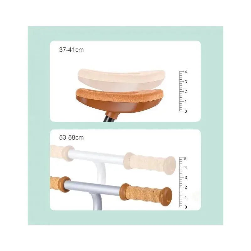 HIGHQUALITY: Made of lightweight aluminum and alloy. Mid-hole seat relives strain on pelvis. Incorporated with sustainable cork. This balance bike provides durability and long-lasting performance.