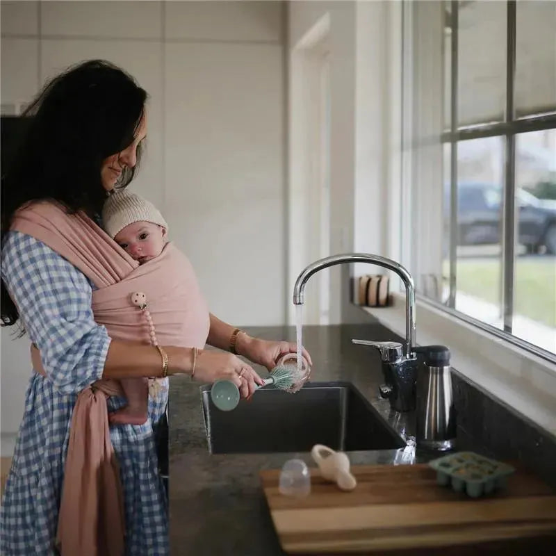 Our double-sided baby bottle brush is a perfect 2-in-1 solution for maintaining your little one's feeding essentials. One side features a larger removable brush head with durable non-scratch silicone bristles, designed to effortlessly clean the inside of baby bottles. The other side features a smaller brush head for precision cleaning bottle nipples and tight spaces. The smaller end conveniently stores inside the suction base to minimize kitchen clutter and keep your brush at arm’s reach. An ergonomic textured handle provides a comfortable grip for thorough cleaning. Parents can easily sterilize the entire brush to help keep baby’s feeding products safe and healthy throughout their feeding journey. The versatile sized brush heads are also great for cleaning water bottles and sippy cups as your little one grows.