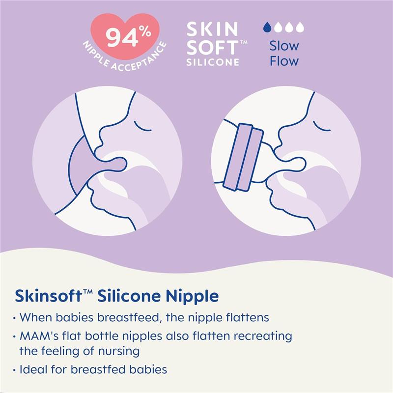 SOFT NIPPLES – 94% of babies accept MAM nipples. The symmetrical shape of the orthodontic nipple feels just like mom and supports healthy jaw and teeth development.