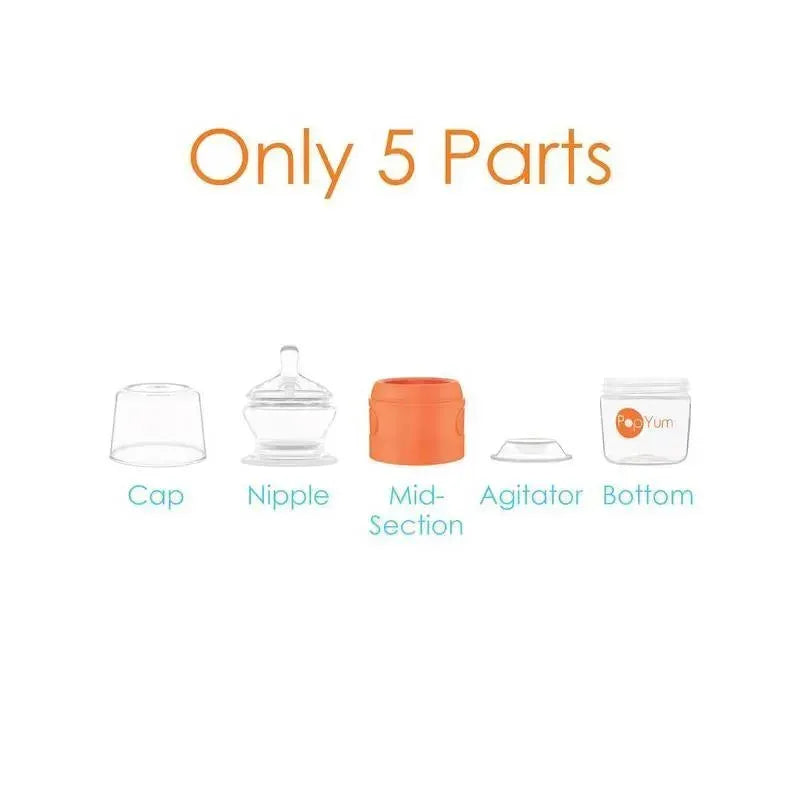 PopYum stores water and formula separately in the bottle until hunger calls. With a single hand, simply pop (press buttons to release formula into water), shake a few times and yum! Prepare enough bottles for the entire day, around town, at daycare, and for travel.