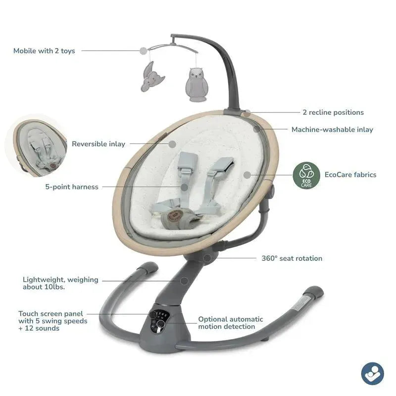 Featuring EcoCare––premium, 100%-recycled fabric made from plastic bottles. 360° seat rotation so the two of you can keep an eye on each other. Optional automatic motion detection activates swing when baby needs soothing. Intuitive touch screen panel controls 5 swing speeds plus 12 melodies and nature sounds. 2 recline positions for customized comfort and 5-point harness for security. Strong yet lightweight at about 10 lbs for easy portability. Removable soft, cozy newborn inlay. Easy to clean with machine-washable fabrics, including the inlay and cover. Mobile with 2 felt toys for baby’s entertainment. Never let babies sleep in rockers, bouncers, or swings.
