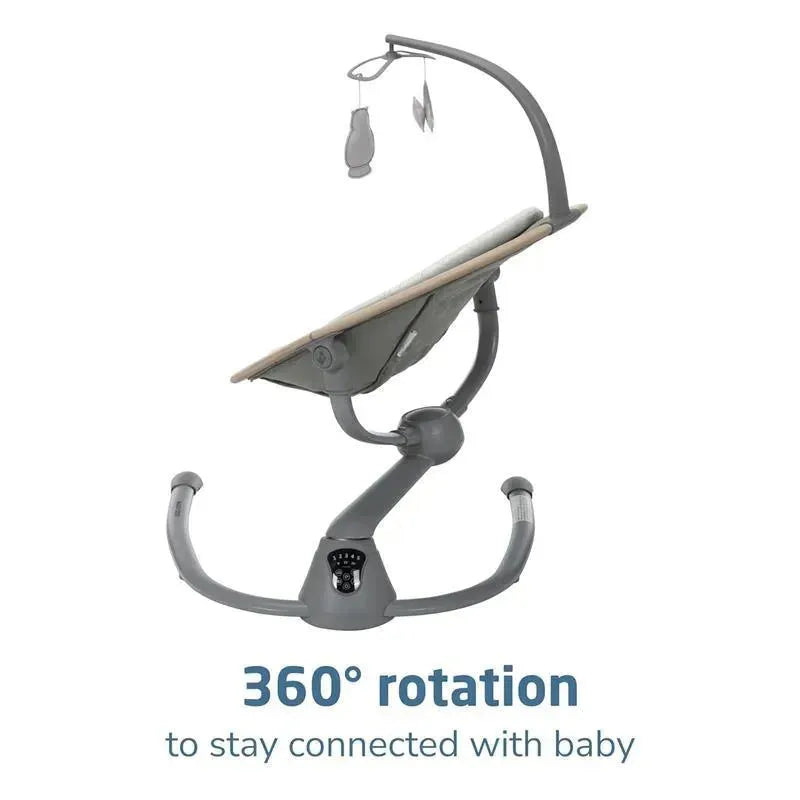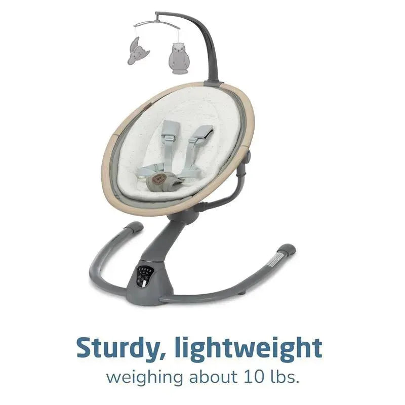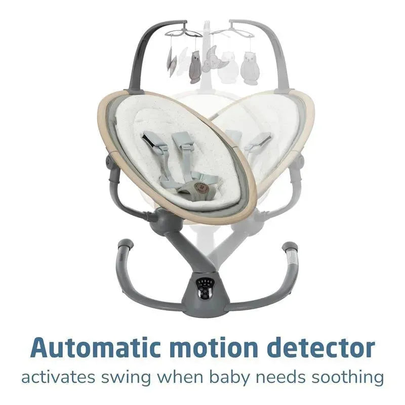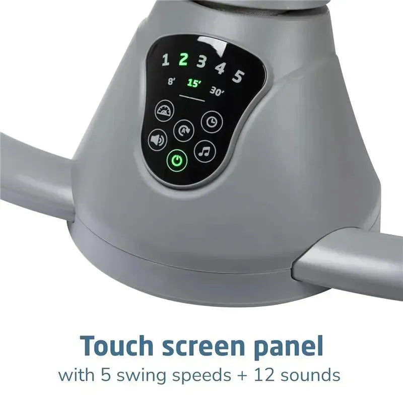 Swing smartly in style with the Cassia baby swing, designed to give you freedom and flexibility while comforting your little one. The automatic motion detection (with on/off button) senses when your infant needs extra soothing and activates the swing. Its built-in touch screen panel allows you to select from 5 swing speeds, plus 12 melodies and nature sounds to keep baby relaxed and entertained. The 360° rotation helps you both feel connected and engaged. At only about 10 lbs., the Cassia Swing is easy to transport from room to room.