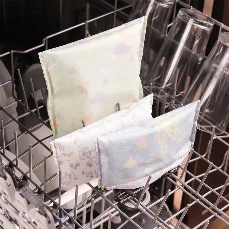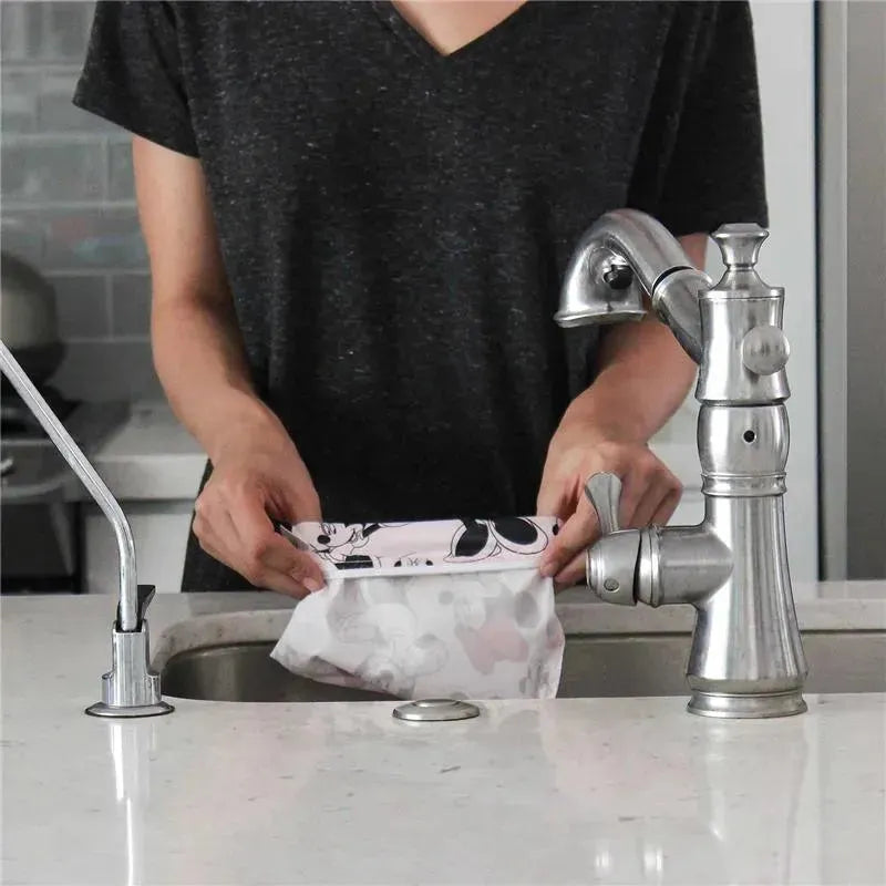 The Bumkins Cinderella Reusable Snack Bag it's an eco-friendly alternative to single-use plastic baggies, snack bags are made from the same easy-wipe waterproof fabric as Bumkins award-winning SuperBibs. A smooth zipper closure doesn’t hold crumbs and single ply construction means no worrying about icky stuff growing between layers of fabric. Great for food or fun, snack bags help organize lunches, toys, electronics and more! Also available in a smaller size, 2 pack option. Machine washable and dishwasher-safe (top rack) for easy cleaning. Large bag measures 7” by 7”, small bags measure 7” across and 3.5” from top to bottom. BPA, PVC, vinyl, phthalate and lead free.