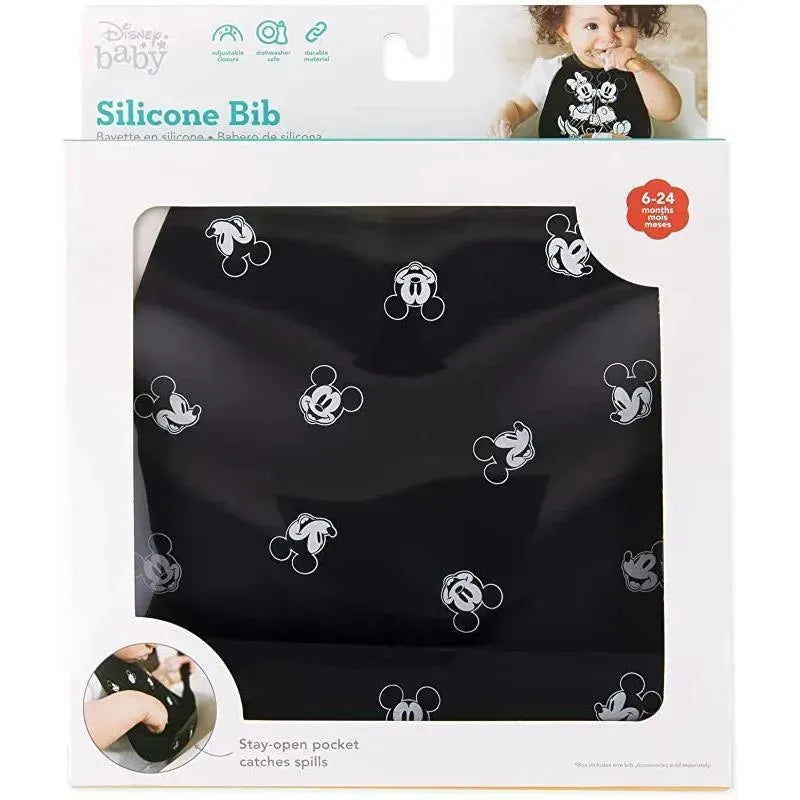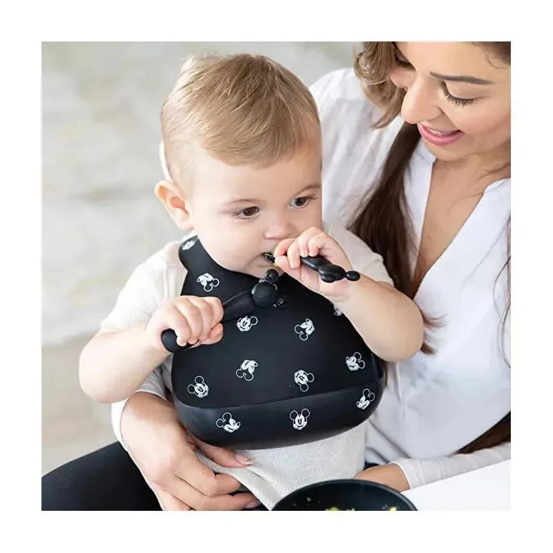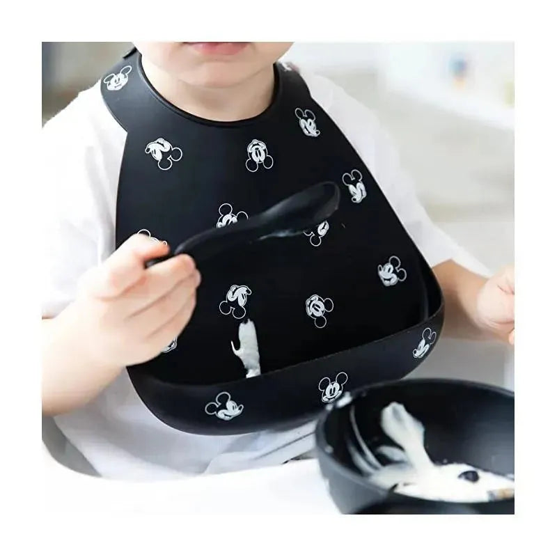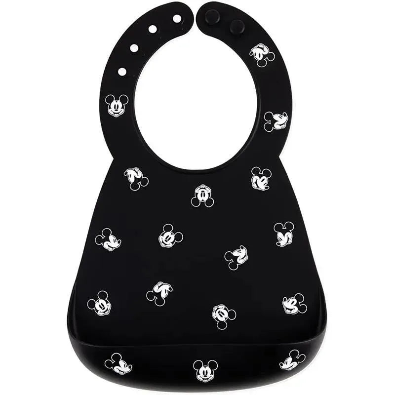 FUN AND EASY – Bumkins’ silicone bib is now available in classic black with Mickey Mouse icons; It’s flexible, comfortable and cleans up quickly