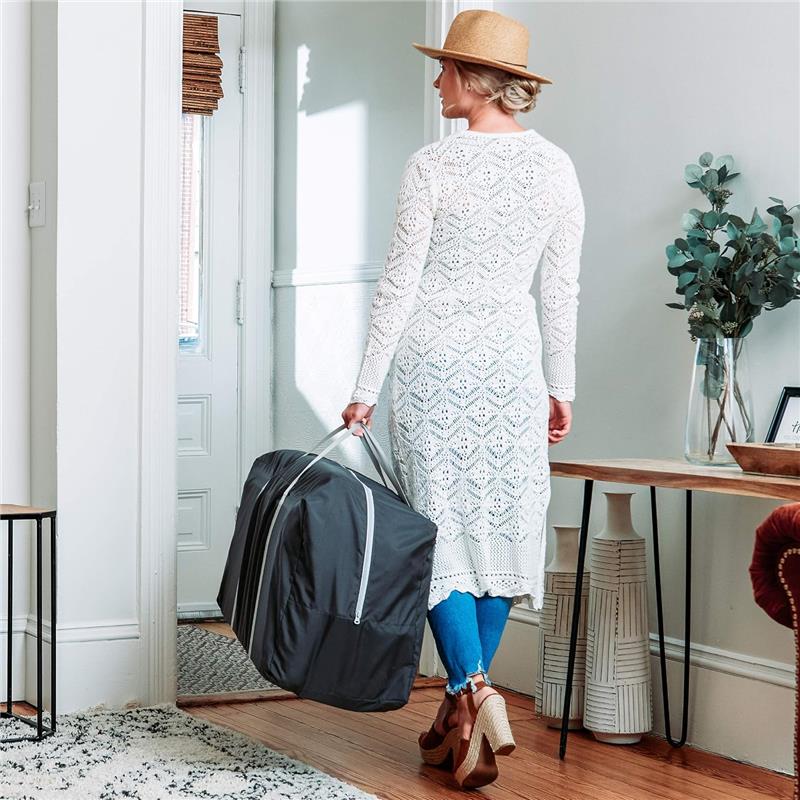 PORTABLE AT HOME OR AWAY – Large, rubberized wheels provide smooth room-to-room maneuverability at home while a simple push-button fold and carry bag create a convenient travel crib. The zip & go parent organizer detaches from the playard for travel convenience.