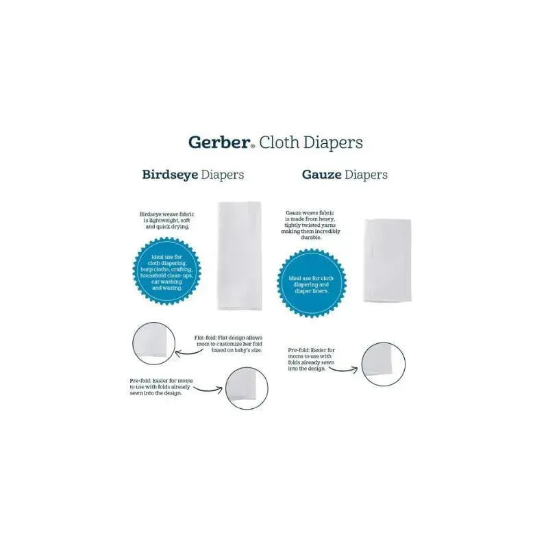 Gerber cloth diapers are comfortable, versatile, and absorbent! Each diaper in this pack is made with 100% birdseye cotton, a soft material that is perfect to wear against baby’s delicate skin. Birdseye cotton is a wonderfully absorbent material that may help to prevent skin irritations and diaper rashes. This pack includes ten birdseye cotton prefold diapers by Gerber. Appropriate to use as newborn diapers all the way up to when baby is ready to potty train, these diapers stand the test on time! When you have a squirming child to change, the 3-ply prefold quickens the pace at which you can get a fresh diaper on and keeps the diaper folded at an optimal width. Their convenient size fits well within diaper shells of all kinds and makes them easy to store in diaper organizers as well as diaper bags. When it’s time to empty the diaper pail, these baby diapers may be run through the washing machine and dryer. Saving time throughout the day is essential to all parents, and Gerber strives to help lessen the load of laundry. These diapers also have a wide range of uses besides just diapering! Their absorbency makes them excellent burp cloths. They’re perfect to use during feeding time as they’re soft enough to efficiently clean any mess from baby’s sweet face. They’re also ideal for crafting! New mothers love to receive personalized baby gifts, and these cloth diapers make for the perfect burp cloths to embroider with monograms or any other creative ideas and ventures. When baby’s potty trained, recycle them into the perfect cleaning rags! And they’re even great for families who don’t have children or whose children are grown. Use them to wash the car, clean the shower, or dust fragile objects around the home! Gerber offers products that are made with high-quality materials to ensure they hold value and are safe to use on baby as well as within the home. These diapers have been a favorite among parents for years and are a staple in any household with children.
