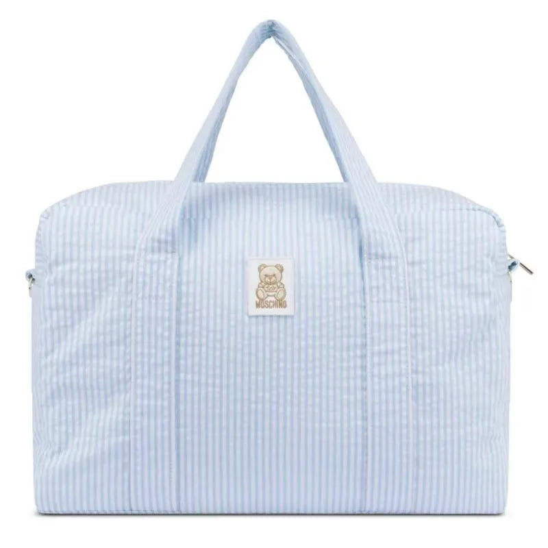 The Moschino Kids Striped Changing Bag blends fashion and practicality for modern parents on the go. Designed in a charming powder blue stripe pattern, this imported diaper bag offers ample space and convenient features to keep essentials organized.