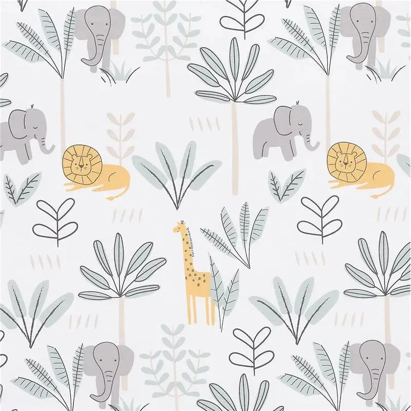 Gray elephants, buff colored lions, and taupe giraffes playing in a field of green foliage decorate this breathable 100% cotton fitted crib sheet.