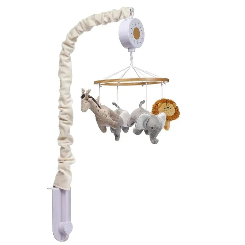 Two gray elephants with white ribbed velour ears, one lion with a curly boucle mane, and one majestic giraffe rotate around this charming musical mobile