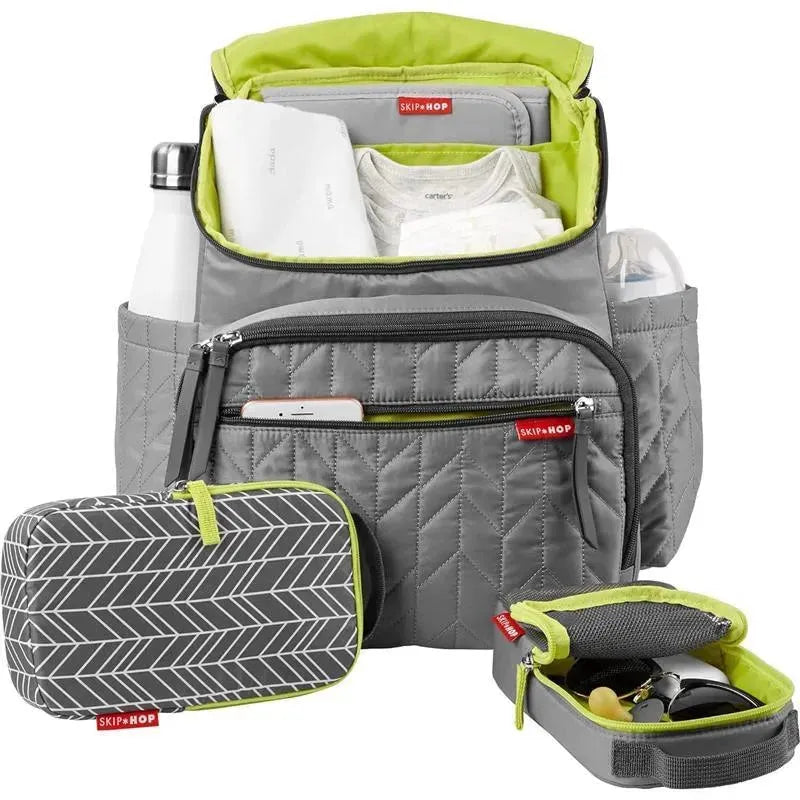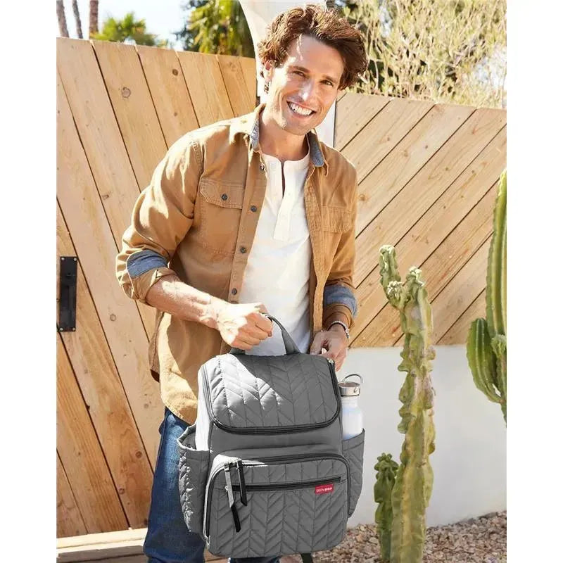 Our lightweight, quilted Skip Hop Forma Gray Diaper Bag Backpack offers hands-free ease and special packing cubes for baby's gear. The spacious interior fits everything from snacks to spare outfits and the extra wide opening makes it easy to pack and grab essentials in a pinch.