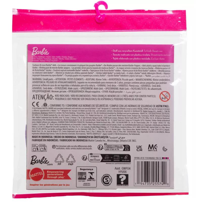 Dress Barbie doll for any challenge with a wardrobe that can keep up! With doll clothes and accessories for two complete outfits in one fashion pack, these Barbie clothing sets offer double the styling fun (doll sold separately). Pieces can include dresses, jackets, tops or bottoms -- and the two accessories help to style a complete look. Mix and match within the set and with other fashions in the line to create different looks and explore style. Includes two outfits and two accessories; doll not included. Universal fit designed to fit most Barbie dolls. Each fashion pack sold separately, subject to availability. Colors and decorations may vary.?