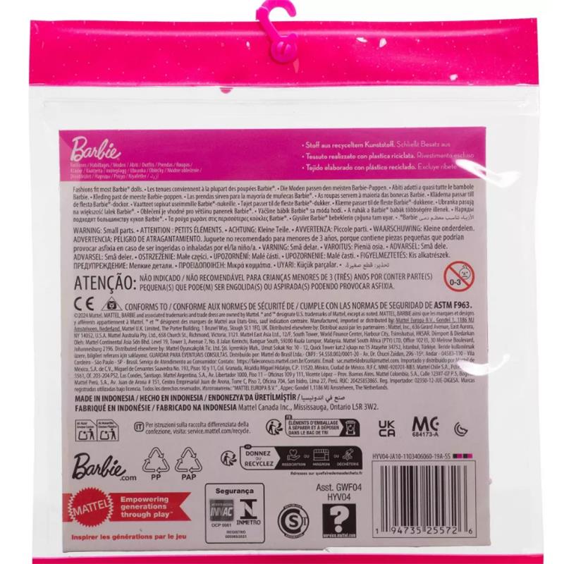 ?The outfits for Barbie doll feature a dress or a top and bottom in a variety of colors and trendy prints, all inspired by the latest trends; some looks also include a jacket