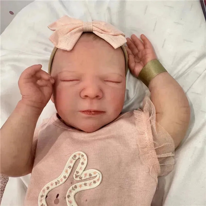 This beautiful white baby doll reborn girl has painted hair and closed eyes.