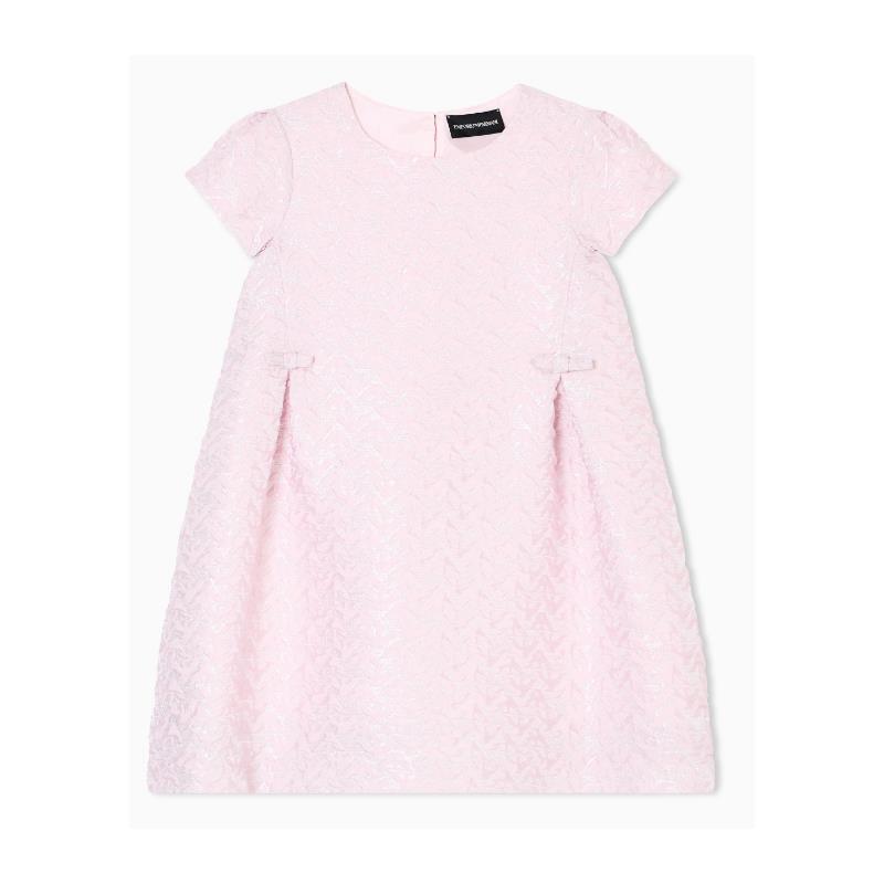 A-line dress crafted from lamé fabric with an exclusive 3D quilted effect featuring the iconic all-over eagle. Emporio Armani Junior brings adult elegance to the little ones' wardrobes: for girls, the lurex jacquard, with its shimmering lamé-effect texture, catches the light and creates a luminous and refined effect, while the quilted fabric with a raised 3D logo adds a touch of originality and modernity.