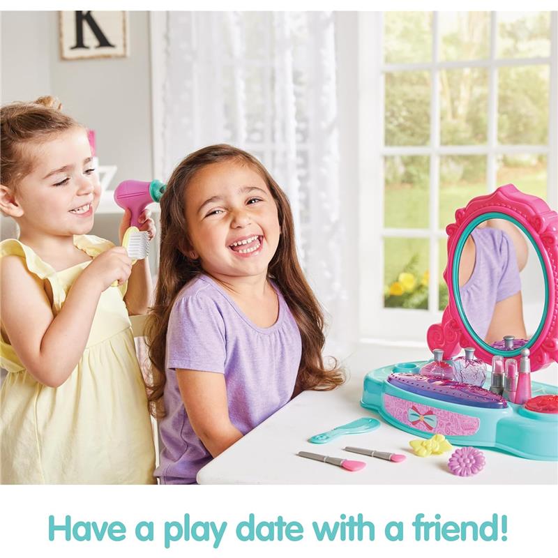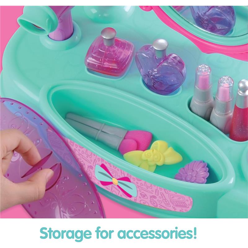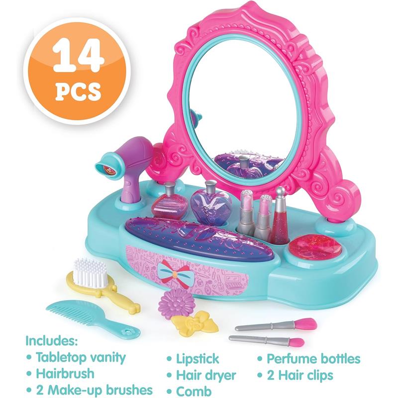 This beautifully designed tabletop vanity is more than just a toy. It's a treasure trove of 14 enchanting pieces, each meticulously crafted to spark their imagination. From a hair dryer that whistles like the wind, brushes that glide like silk, to perfume bottles that hold the sweet scent of their dreams and so much more. Each piece is a part of their fairytale, a prop in their play that brings their stories to life.