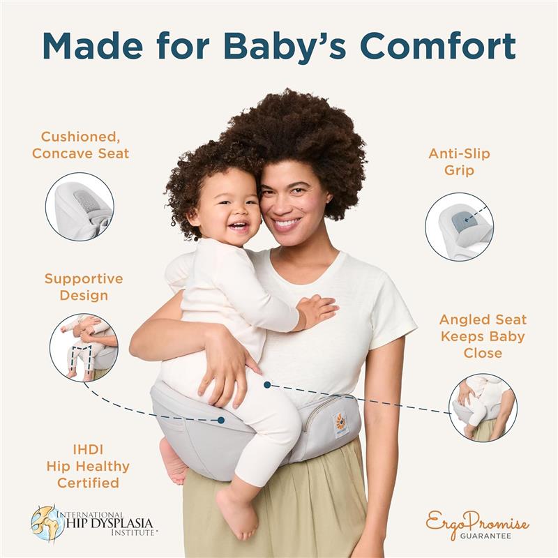 SUPPORTIVE ERGONOMIC SEAT: The cushioned seat of hip baby carrier is gently curved to support baby’s hips and thighs. The anti-slip panel helps keep baby in position while the angle of the seat promotes closeness and comfort.