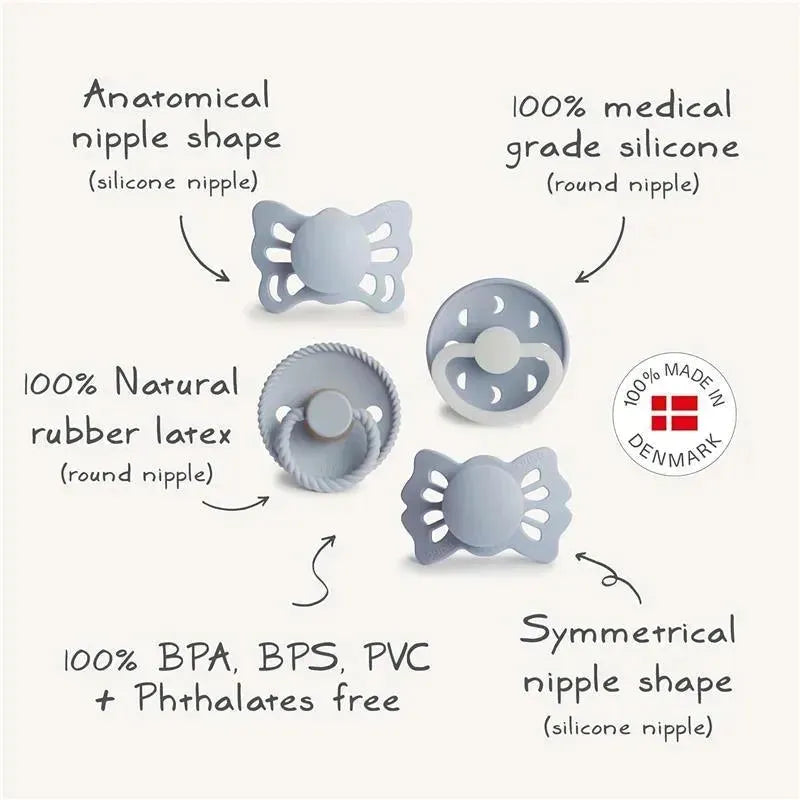 Craftsmanship and Safety: FRIGG Baby’s First Pacifier 4-pack set is 100% designed and made in Denmark and free from BPA, BPS, PVC and phthalates.