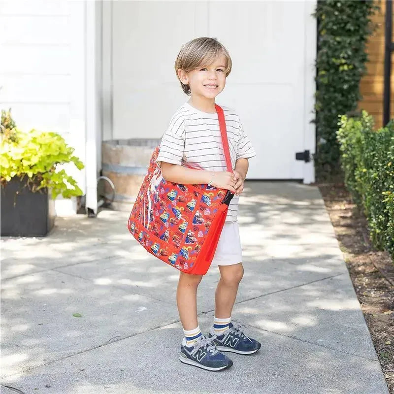 Say hello to Lightning McQueen and Mater on the Disney Baby by J.L. Childress 3-in-1 Travel Lap Tray and iPad Tablet Holder. This convenient travel tray will keep kids happy and entertained when on the go, providing a sturdy surface for schoolwork, coloring, snack time and more. The lap tray features raised edges to keep toys from rolling off and prevents spills. The tray has two mesh pockets that can hold snacks, crayons, toys, and more. The pockets can easily be detached and stored inside the large zippered compartment. A cup holder keeps drinks easy to reach and a buckle strap secures the tray around the child's waist. Turn the tray over and a full-size tablet holder will keep toddlers and kids peacefully entertained. The tablet holder fits all sizes of ipads and tablets, and can be used in the car, on an airplane or in a stroller. The Disney Baby by J.L. Childress 3-in-1 Travel Lap Tray and iPad Tablet Holder can also be used as a travel tote bag! Children love carrying their own, special bag and the large zippered compartment holds coloring books, worksheets, crayons and more. The shoulder strap is fully adjustable. Made out of durable, wipe-clean materials, the Disney Baby by J.L. Childress 3-in-1 Travel Lap Tray and iPad Tablet Holder is sure to become your favorite travel product for kids!