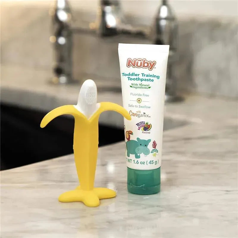 Dr. Talbot's Toddler Training Toothpaste offers a delicious, fruity freshness that kids love, perfect for promoting healthy daily oral care habits. Best of all, our nature-inspired formula is fluoride and paraben free, so you can be sure there are no harsh chemicals. Safe if ingested when used as directed, Dr. Talbot's Toddler Training Toothpaste will help show off your little one's bright, polished smile. Our silicone toothbrush makes brushing teeth fun. Its soft bristles massage and provide a gentle cleansing experience. The bright yellow banana is sure to catch your little one's attention, making brushing more enjoyable.