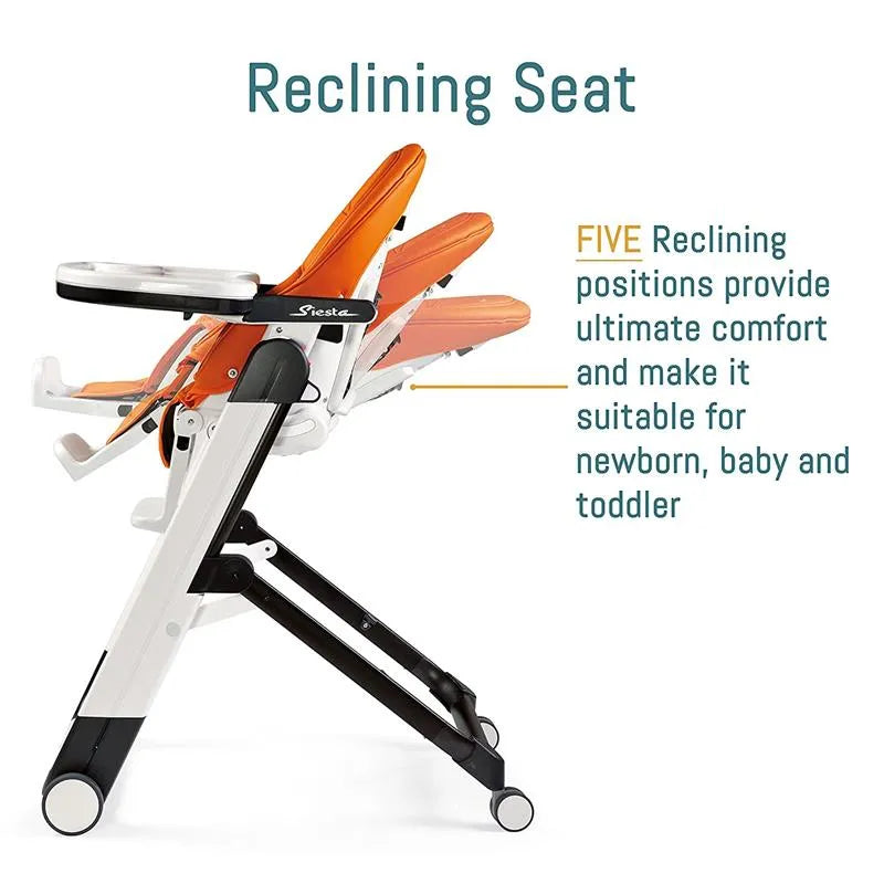 The popular Peg-Perego Siesta high chair is ultra-portable, adjustable and reclinable—allowing your child to sit upright for mealtime and recline comfortably for a "siesta."