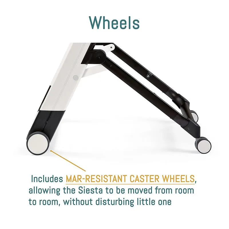 When your family is on the move, the Siesta can accompany you, thanks to its floor-friendly caster wheels and compact fold that allows for easy storage when not in use. Made in Italy, the Siesta is made with soft Prima Classe fabric that wipes clean with a damp cloth.