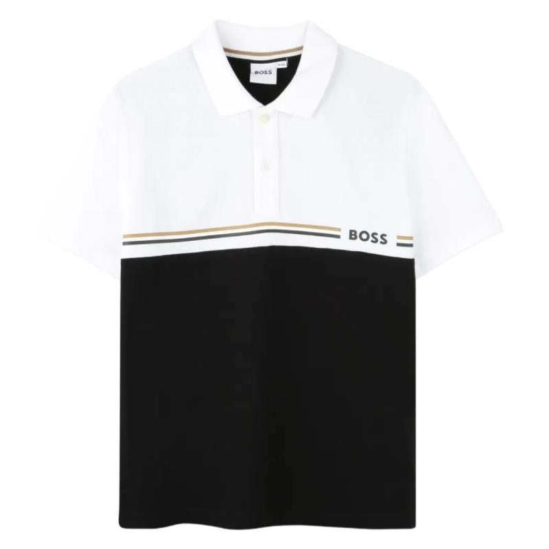 Elevate your style with the Hugo Boss Short Sleeve Polo in Black and White. This sleek polo features a classic fit with a modern color-block design that seamlessly blends sophistication and casual elegance. The crisp white upper contrasts beautifully with the deep black lower half, while subtle stripe detailing adds a touch of refinement. Crafted from premium materials for comfort and durability, this polo is perfect for any occasion—whether you're dressing up for an evening out or keeping it casual on a weekend getaway. Make a statement of timeless style with Hugo Boss.