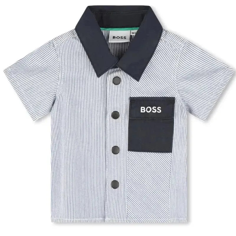 This BOSS set elevates everyday outfits to a higher level. The short-sleeved shirt features stripes and a chest flap pocket with contrasting logo embroidery. The shorts have front pockets. These 2 pieces are made of cotton twill and presented in a gift box.