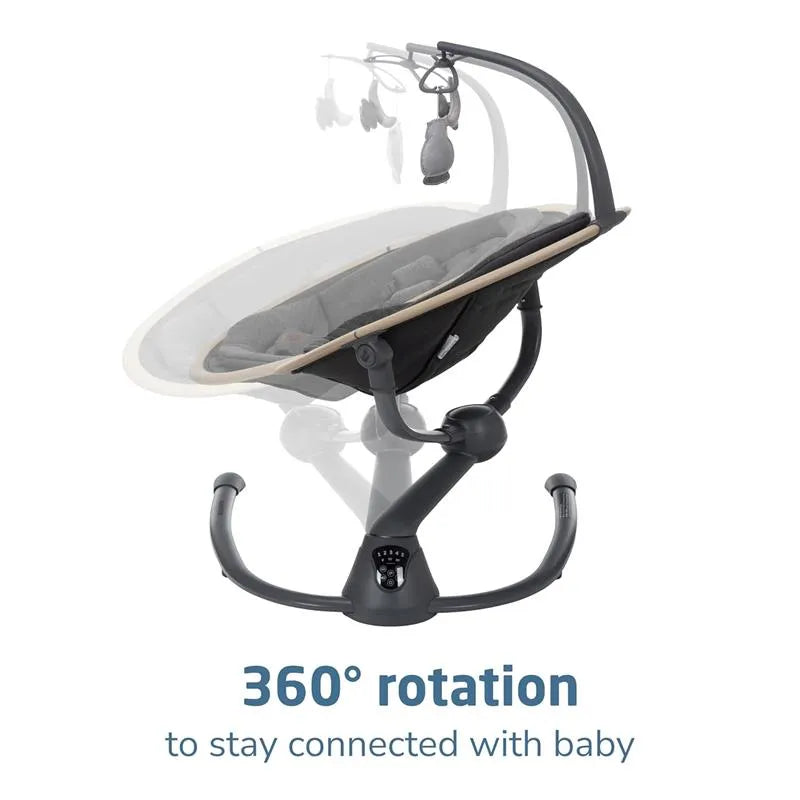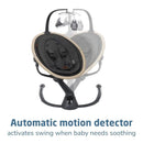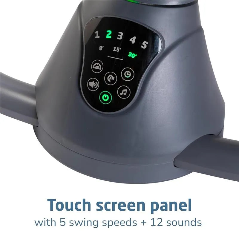 Swing smartly in style with the Cassia baby swing, designed to give you freedom and flexibility while comforting your little one. The automatic motion detection (with on/off button) senses when your infant needs extra soothing and activates the swing. Its built-in touch screen panel allows you to select from 5 swing speeds, plus 12 melodies and nature sounds to keep baby relaxed and entertained. The 360° rotation helps you both feel connected and engaged. At only about 10 lbs., the Cassia Swing is easy to transport from room to room.