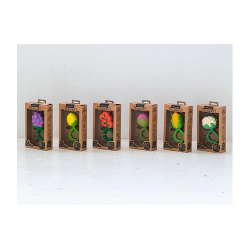 The exterior is made of 100% natural rubber, and inside are upcycled cherry seeds that turn this teether into a rattle. 2 in 1!