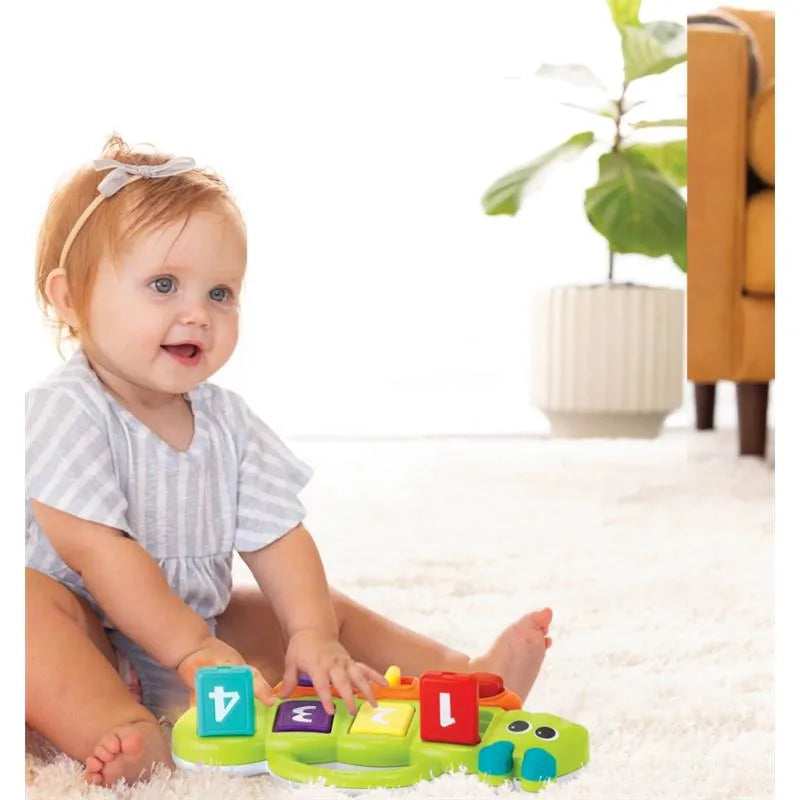 As your baby engages with their friendly caterpillar companion, they'll be unknowingly working on their coordination and fine motor skills, all while their memory grows stronger with each playful interaction. The soft, charming sounds, and twinkling light effects triggered by the press or turn of a button add an enchanting musical dimension to their playtime.
