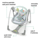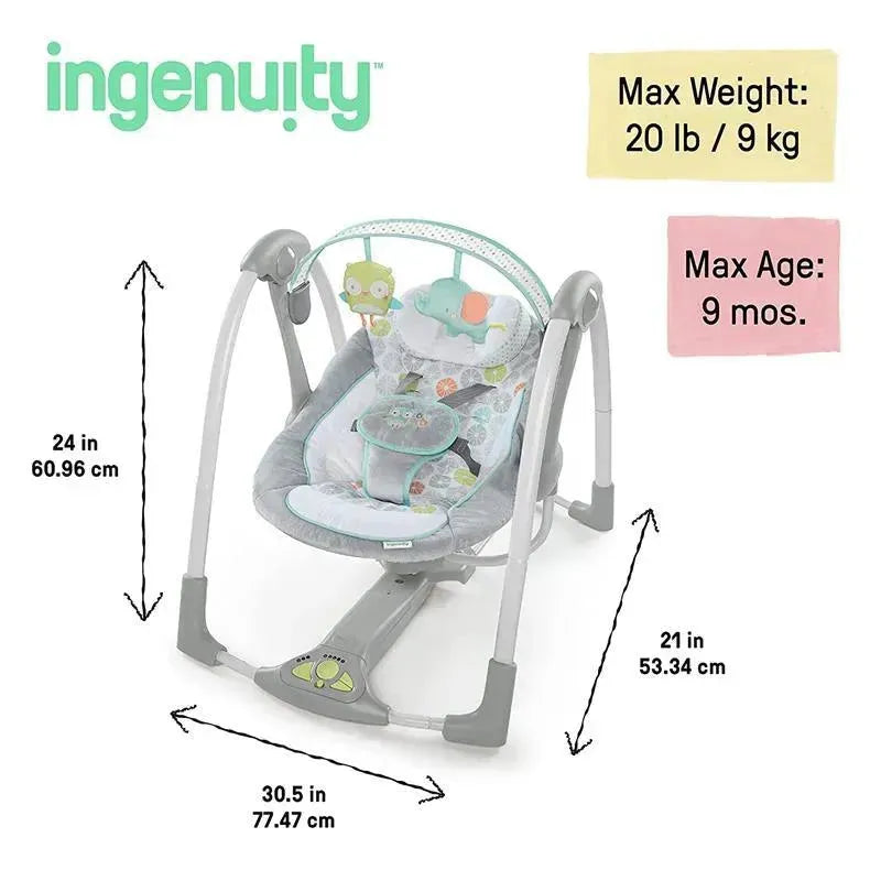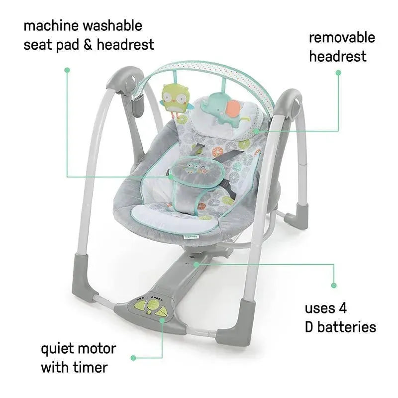 When you have places to go, the Ingenuity Swing 'n Go Portable Swing is along for the ride. The compact frame is easy to transport, with all the same features you’d expect from a full-sized swing. Your baby can enjoy automatic swinging motions, listening to soothing nature sounds and melodies, and reaching for the 2 plush hanging toys – a sweet owl and elephant. Powered by 4 D batteries (not included), the swing’s innovative Hybridrive technology saves on batteries so baby enjoys longer swing times. You don’t have to sacrifice function with this mini swing. The 5-point harness and non-slip feet help ensure your baby’s safety, and comfort is in full swing with the ultra soft seat pad. The swing speeds adapt to your growing baby with weight-sensing technology, and the extra head support can be removed when baby outgrows it. With a gender neutral design, this swing makes a great baby shower gift idea for boy or girl. Your baby’s happy place can be any place with this on-the-go swing.