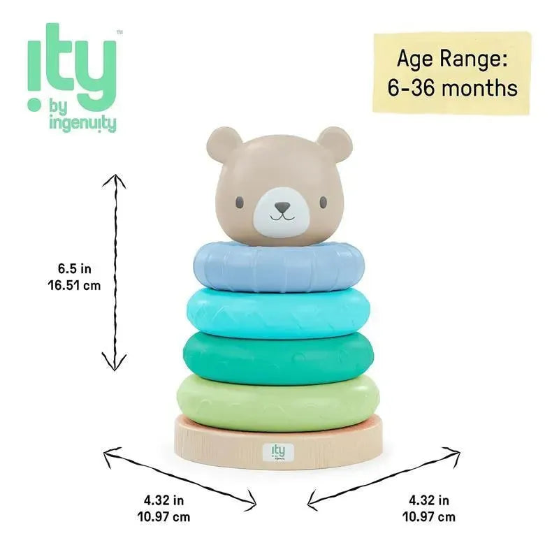 Unpack a wonderful way for infants and toddlers to discover textures and colors with the ity by Ingenuity Cutie Stacks - Nate! Adorable "a-ha" moments are only a stack away. Topped with super-cute Nate the bear, Cutie Stacks comes with a faux wood stand and 4 colorful, lightweight, BPA-free multi-textured rings that are easy for baby to hold and stack?. Cutie Stacks are an engaging way to aid infants in developing sensory skills, such as color learning, and helps stimulate gross motor development through stacking. This infant stacking toy coordinates with other woodland-inspired characters in the ity by Ingenuity collection such as the soft Cozy Lovey - Nate and Cutie Stacks starring Nally the owl. Be sure to wipe stacking toy clean before use. Cutie Stacks - Nate is recommended for age 6 months and up. This fun stacking toy makes for a fantastic baby registry essential item encouraging hands-on, screen-free play, and developmental skill-building!